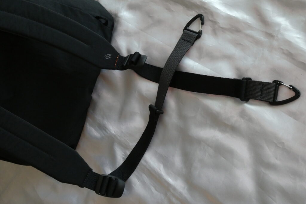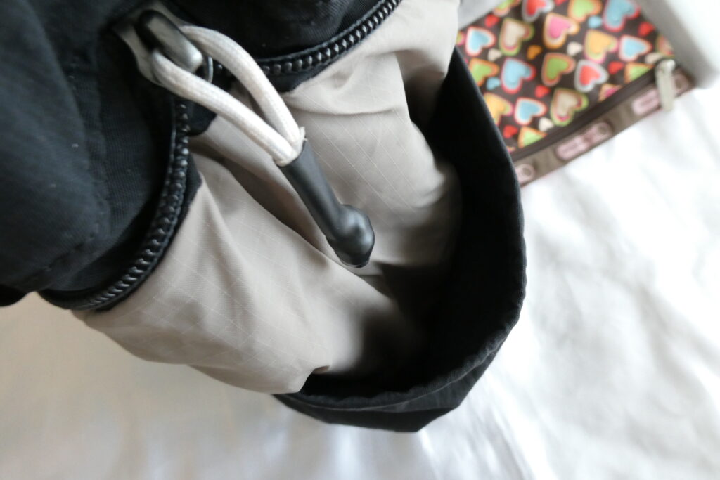 本来はクリップ式バックパックストラップの収納スペースですが、底が閉じてあることでポケットのように使えます。
